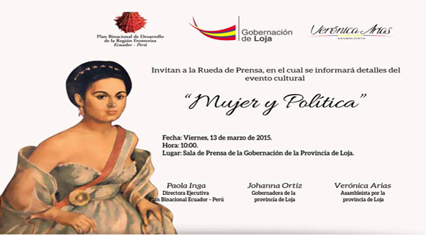 En el marco del Día Internacional de la Mujer, la Gobernación de Loja, Plan Binacional y la Asambleísta Verónica Arias, realizarán este 18 de marzo a partir de las 18H00 en el centro Cultural Alfredo Mora Reyes el evento cultural “Mujer y Política”, en donde se analizará la vida y obra de Manuela Sáenz y su legado para la mujer actual.